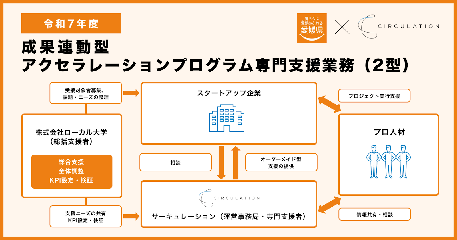30,000名以上のプロ人材の経験・知見を複数の企業でシェアし、経営課題を解決するプロシェアリング事業を運営する株式会社サーキュレーション(所在地:東京都渋谷区、代表取締役社長:福田 悠、以下サーキュレーション)は、愛媛県より「令和7年度成果連動型アクセラレーションプログラム専門支援業務(2型)(以下、本事業)」を受託しました。本事業では、愛媛発のスタートアップを創出・育成するため、成果連動型民間委託契約方式を活用し、起業家・スタートアップ・大学発ベンチャー等が抱える多様なニーズに応じた複数の支援者による支援体制を構築し、集中的な伴走支援事業(アクセラレーションプログラム)を実施します。