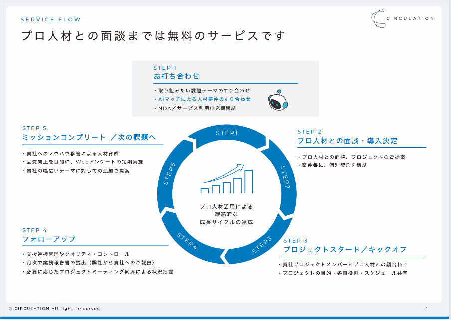 ヒアリング中の音声をリアルタイムでAIが解析し、「この課題ならこのプロ人材」が自動でレコメンドされます。候補提示や略歴提出、Web面談の調整までは無料です。