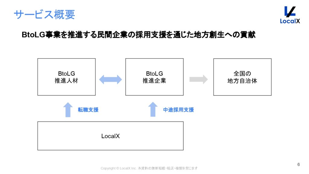 そこで取り組んでいるのが、地方創生領域における転職支援と採用支援です。具体的には、自治体と連携しながら事業を進める企業、いわゆるBtoLG(地方自治体向けビジネス)を展開する企業に対して人材をご紹介しています。同時に、地域に関わる仕事に挑戦したい人のキャリア支援も行っています。