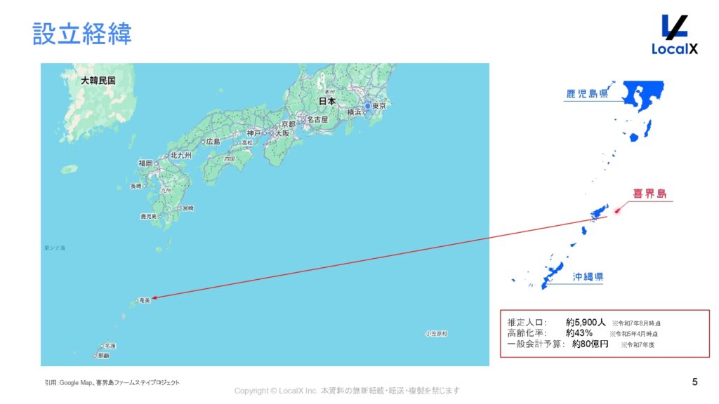 私は鹿児島県の離島・喜界島で生まれ育ち、高校までの18年間を同島で過ごしました。高校卒業後に上京し、新卒で三井物産に入社して約12年間勤務しましたが、地域間の機会格差の是正と地域の可能性の最大化に取り組みたいという思いから退職し、LocalXを創業しました。